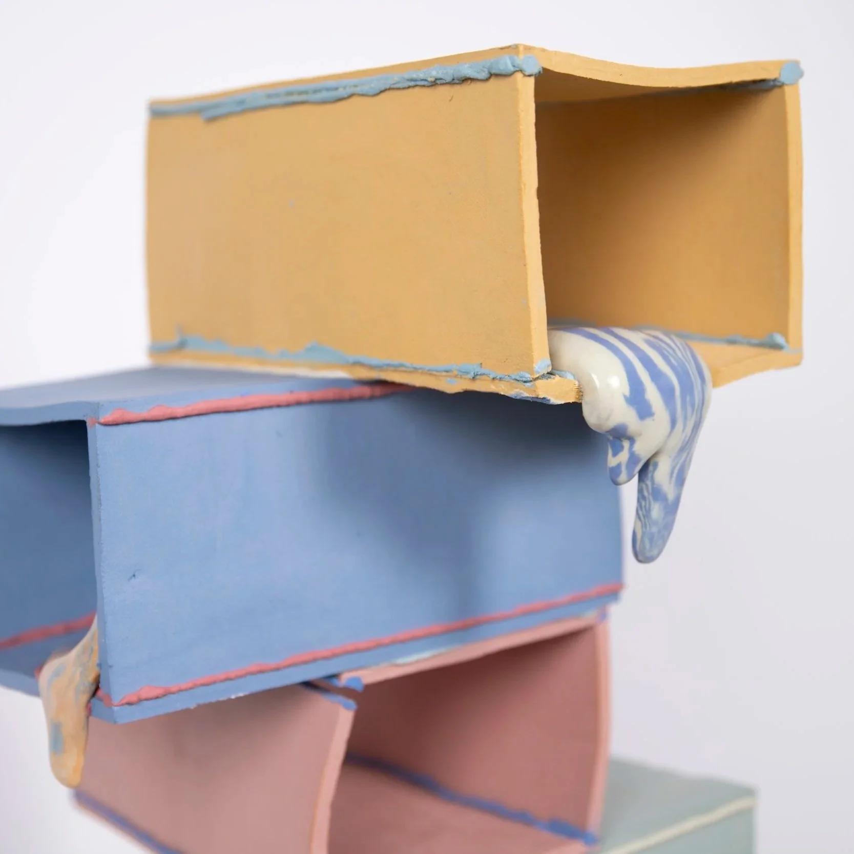 From a variety of more or less abstract ceramic archi- tectures, colorful slime-like beings dangle, some displaying recognizable anthropomorphic traits and postures. As an installation, the work presents the viewer with a pastel-colored, doll-sized urban land- scape. At first glance, the fluid, dynamic forms appear to be in motion, yet they are frozen in time—as if someone had pressed pause on the playback of a hazy, dreamlike memory. The installation is accompanied by the sound of muffled electronic music, its low frequencies emanating softly from a small speaker hidden within the structures.